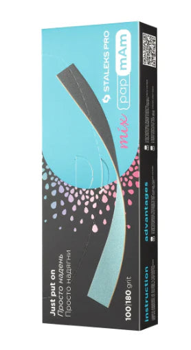 De Staleks Pro papmAm Mix voor rechte nagelvijlen (100/180 grit, 50 stuks) is een wegwerpbare, dubbelzijdige vijl die speciaal is ontworpen voor gebruik met rechte bases zoals de MBE-20, SPBE-20 en WBE-20. Deze vijlen zijn ideaal voor zowel manicure als pedicure en bieden een hygiënische en efficiënte werkwijze.